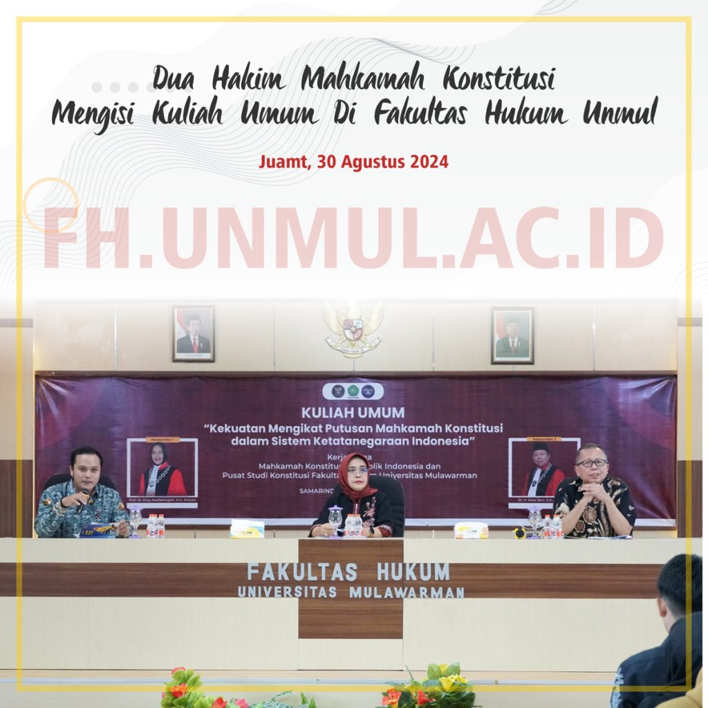 Pada Jumat, 30 Agustus 2024 dua Hakim Mahkamah Konstitusi Prof. Dr. Enny Nurbaningsih, S.H., M.Hum. dan Dr.H. Arsul Sani, S.H., M.Si., Pr.M. berkunjung ke Fakultas Hukum Universitas Mulawarman untuk mengisi Kuliah Umum dengan tema “Kekuatan Mengikat Putusan Mahkamah Konstitusi dalam Sistem Ketatanegaraan Indonesia”. Kuliah Umum ini diselenggarakan atas kerjasama Pusat Studi Konstitusi Fakultas Hukum Universitas Mulawarman dengan Mahkamah Konstitusi Republik Indonesia.